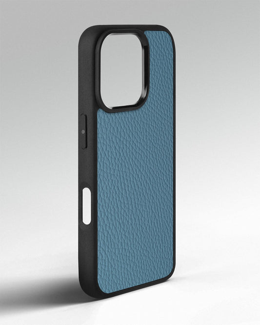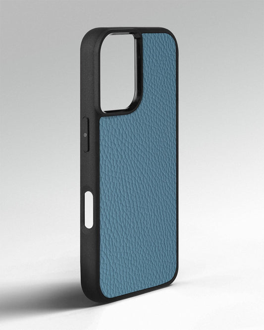 Case made of blue ostrich leather without follicles for iPhone 14