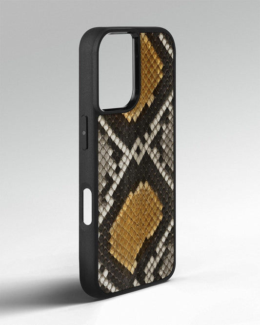 Case made of gray-yellow python leather with small scales for iPhone 16