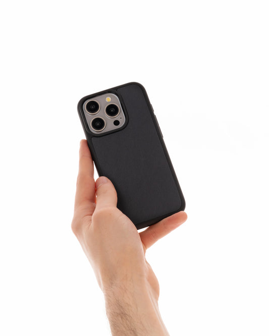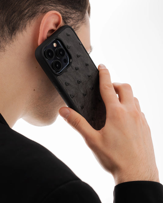 Case made of dark gray ostrich leather without follicles for iPhone 16 Pro