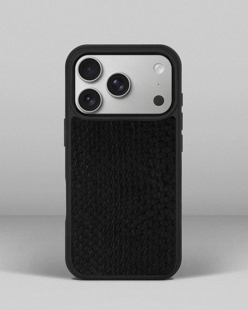 Зробіть свій вибір в користь чохла із чорної шкіри пітона з дрібними лусочками для iPhone 17 Pro і насолоджуйтеся поєднанням стилю, елегантності та індивідуальності. Цей чохол вразить ваше оточення своїм неповторним виглядом і надасть вашому смартфону вишуканості.